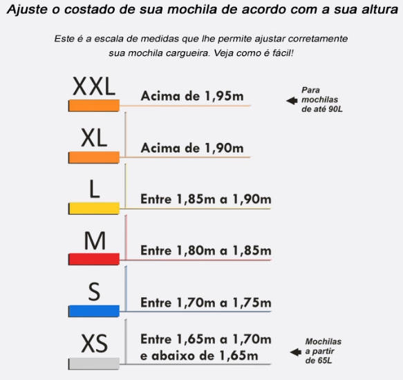 Nós preparamos uma referência aproximada entre as medidas do costado e a altura do usuário para você fazer o ajuste de sua mochila, caso não tenha acesso ao gabarito.