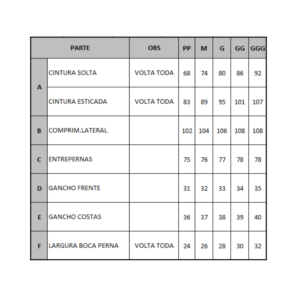 | Tamanhos | P, M, G, GG, GGG |
